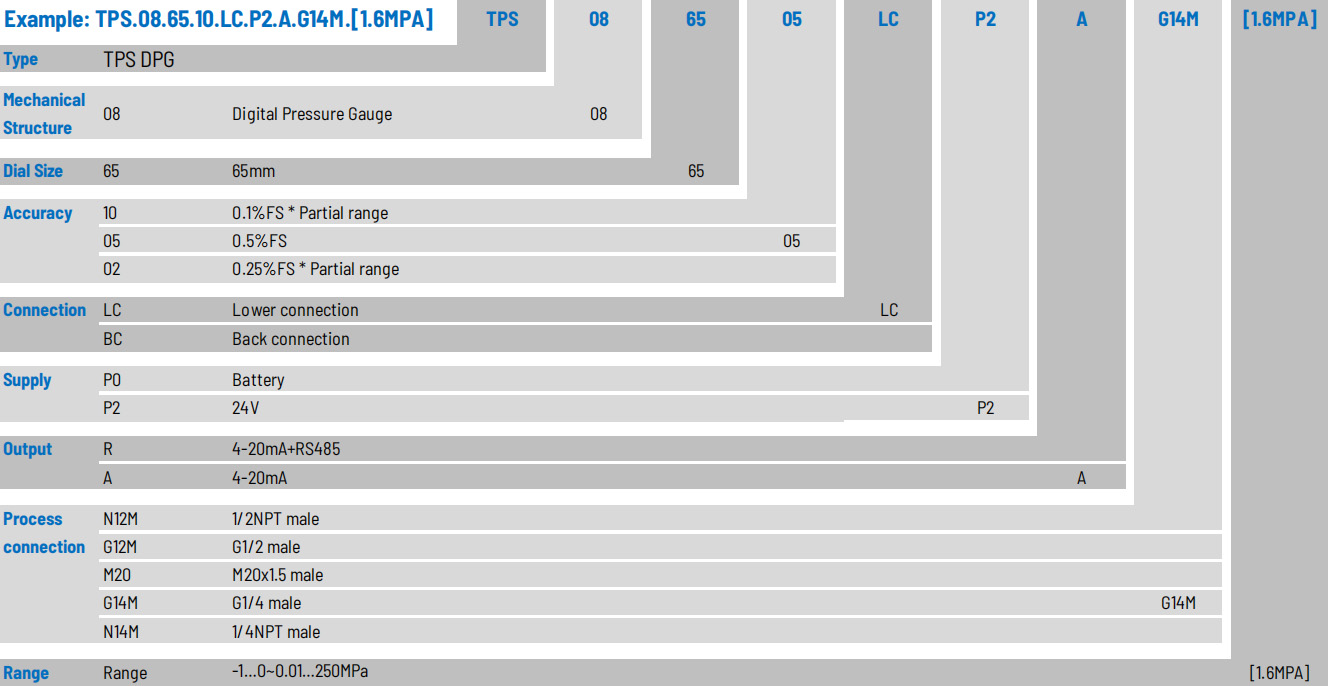 Das digitale Manometer der Serie TPS.08 ist ein Gerät, das den Druck präzise und in Echtzeit anzeigen kann und sich durch Merkmale wie geringen Stromverbrauch und gute Langzeitstabilität auszeichnet. Es ist mit einem LCD-Bildschirm ausgestattet und verfügt über mehrere Funktionen wie Reset, Hintergrundbeleuchtung, Ein-/Ausschalten, Geräteumschaltung und Unterspannungsalarm. Es ist einfach zu bedienen und zu installieren. Das Produkt verfügt über ein Gehäuse und eine Verbindung aus Edelstahl 304, die eine gute Vibrationsfestigkeit aufweisen und nicht korrosive Medien wie Gase, Flüssigkeiten, Öl usw. messen können. Es wird in der tragbaren Druckmessung, bei der Anpassung von Automatisierungsgeräten, in Druckbehältern und in anderen Messbereichen verwendet.